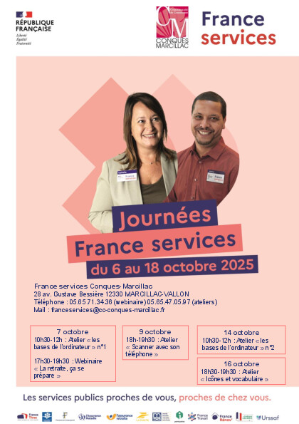Dans le cadre des journées France services se déroulant cette année du 6 au 18 octobre, France services Conques-Marcillac, en partenariat avec la Cyber Base Conques-Marcillac, organise différentes actions.