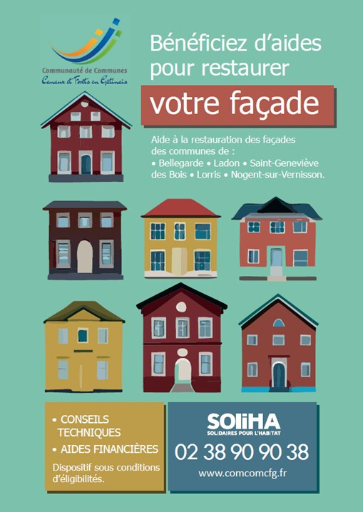 Les communes de Bellegarde, Châtillon-Coligny, Ladon, Lorris, Nogent-sur-Vernisson et Sainte-Geneviève-des-Bois ont mis en place une « Aide à la rénovation des façades » sur une partie des rues de leur centre-ville, pour l’amélioration esthétique des façades. Ces travaux se portent sur les façades, pignons et façades latérales visibles depuis la rue.