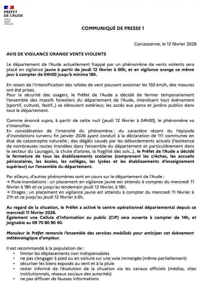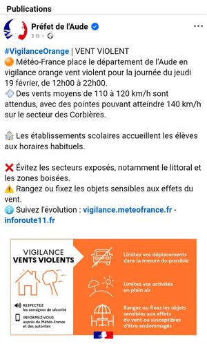 Le département de l'aude est placé en viligance orange pour le phénomène de vent violent le Jeudi 19 Février de 12h jusqu'à 22h.