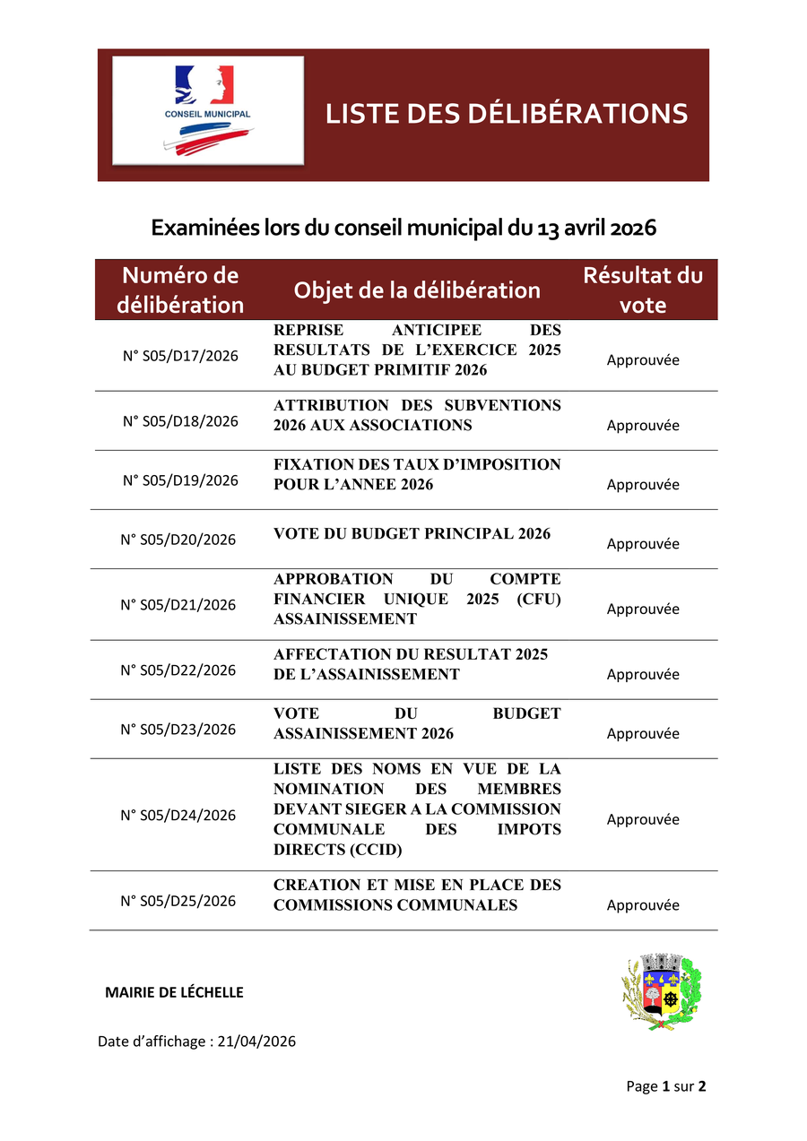 LA MAIRIE DE LÉCHELLE RECHERCHE UNE PERSONNE SUSCEPTIBLE D'ASSURER UN REMPLACEMENT DE L'AGENT DE CANTINE PENDANT 4 JOURS SOIT LES 18, 19, 21 ET 22 MAI 2026. (SMIC, HORAIRES DE TRAVAIL : 11H45-14H).
