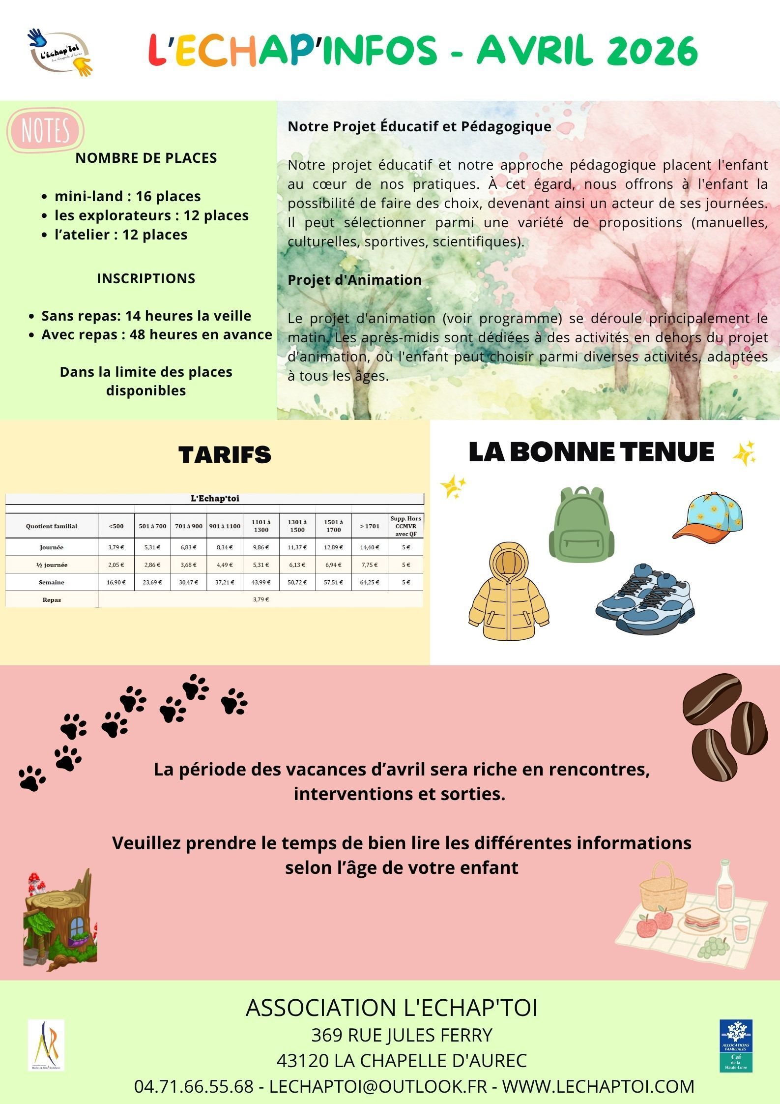 Les semaines de vacances 32 et 35 sont ouvertes aux inscriptions du 1er mars au 1er avril 2026. Les contraintes budgétaires amènent l'association à prendre des décisions drastiques en termes d'accueil pour limiter un impact considérable sur le budget.