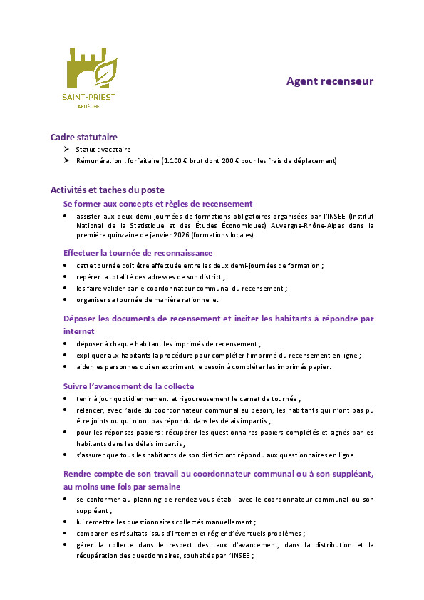 - les opérations de recensement du 15 janvier au 14 février 2026 avec une disponibilité essentiellement en soirée et le samedi.