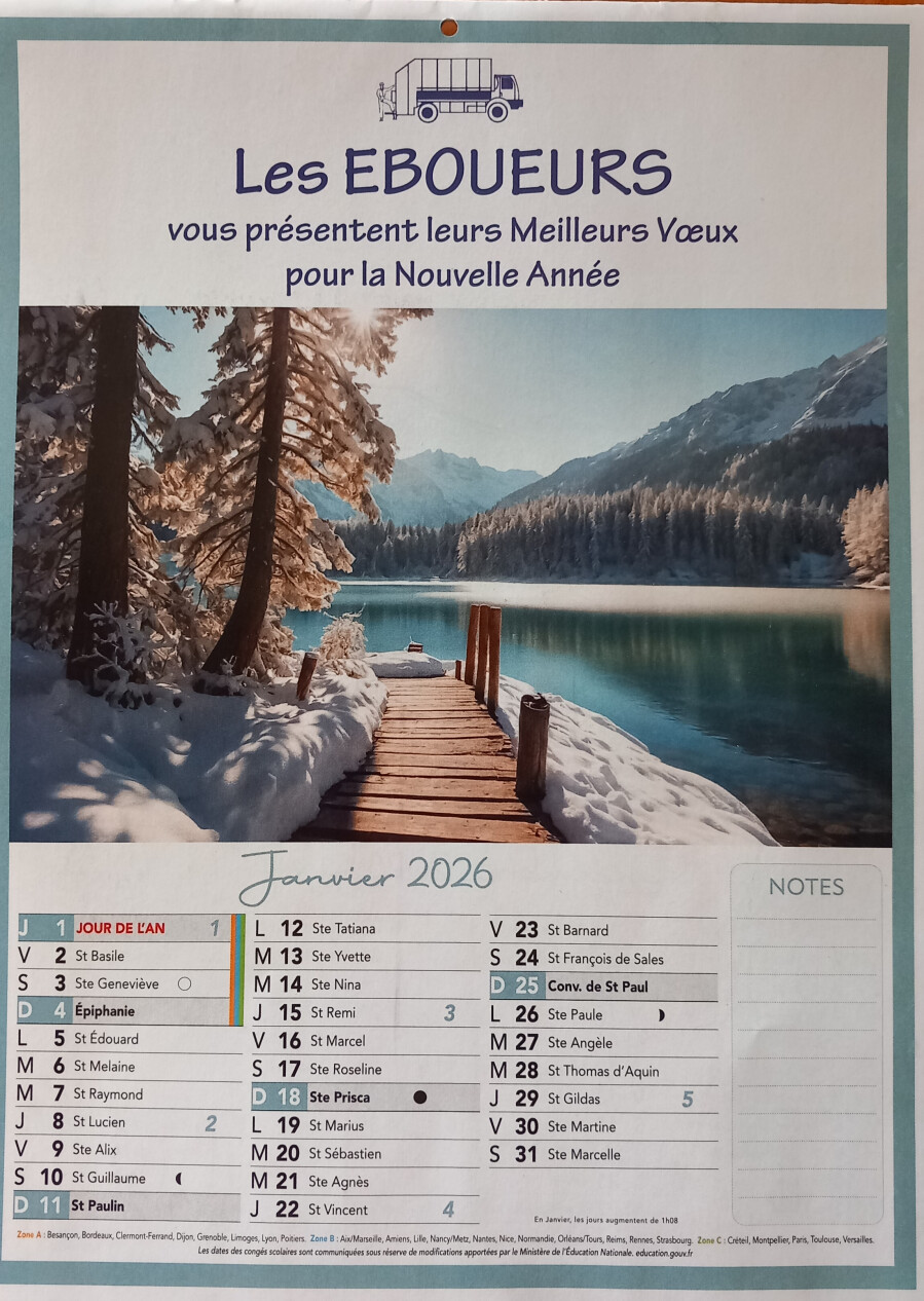 Nous vous informons que deux éboueurs seront de passage au cours du mois de novembre sur notre commune pour vendre leur calendrier 2026.