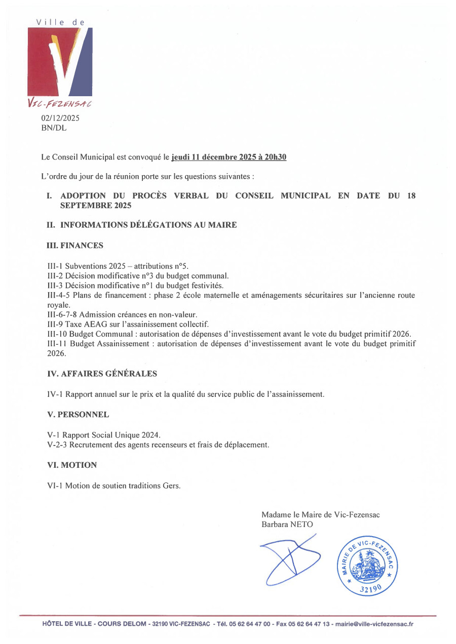Le Conseil Municipal est convoqué le jeudi 11 décembre 2025 à 20h30