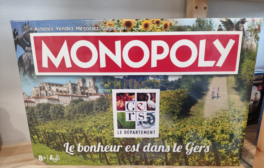Venez faire un tour à la boutique de l'Office de tourisme, il y en a pour tous les goûts : rillettes, foie gras de canard, miel, confiture, jus de pomme, bières, bijoux, couteaux, savon, shampoings solides, tasses, livres, jeux de société et même le célèbre Monopoly du Gers 😃