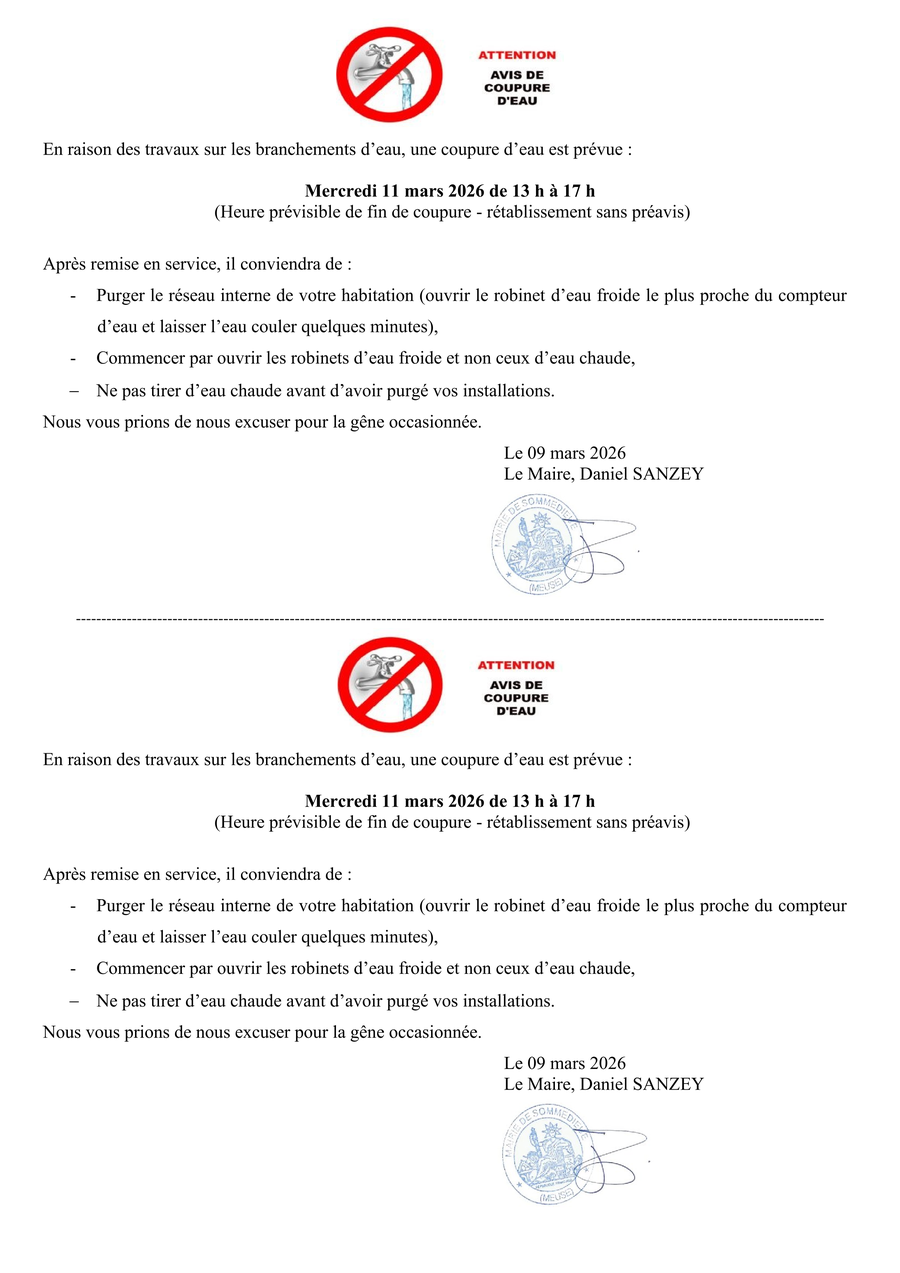 En raison des travaux de branchement d'eau une coupure d'eau est prévue sur les rues suivantes.