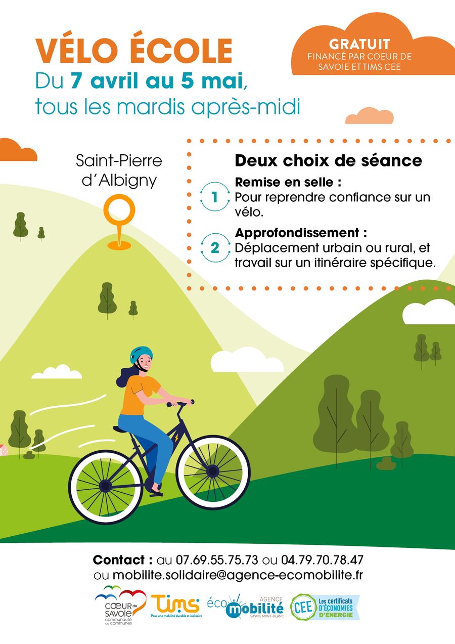 Du 7 avril au 5 mai 2026, tous les mardis après-midi, venez (re)découvrir le plaisir du vélo en toute sécurité, à Saint-Pierre-d’Albigny !