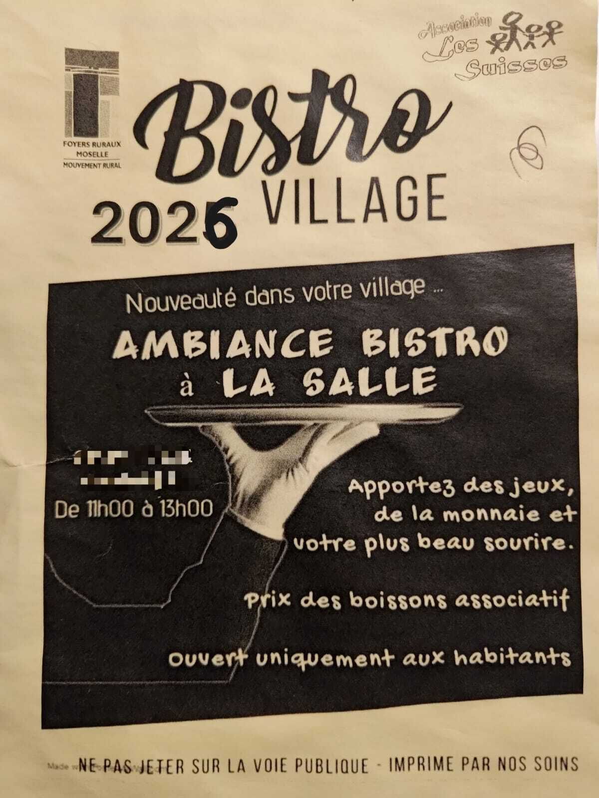 La prochaine édition du Bistro du village organisé par l'association " Les Suisses" se déroulera ce dimanche 8 mars 2026 de 11h à 13h.