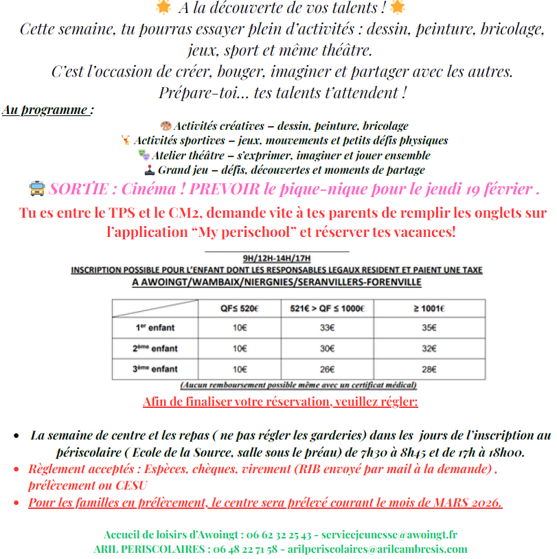 Pour toutes informations : 03.58.24.00.00