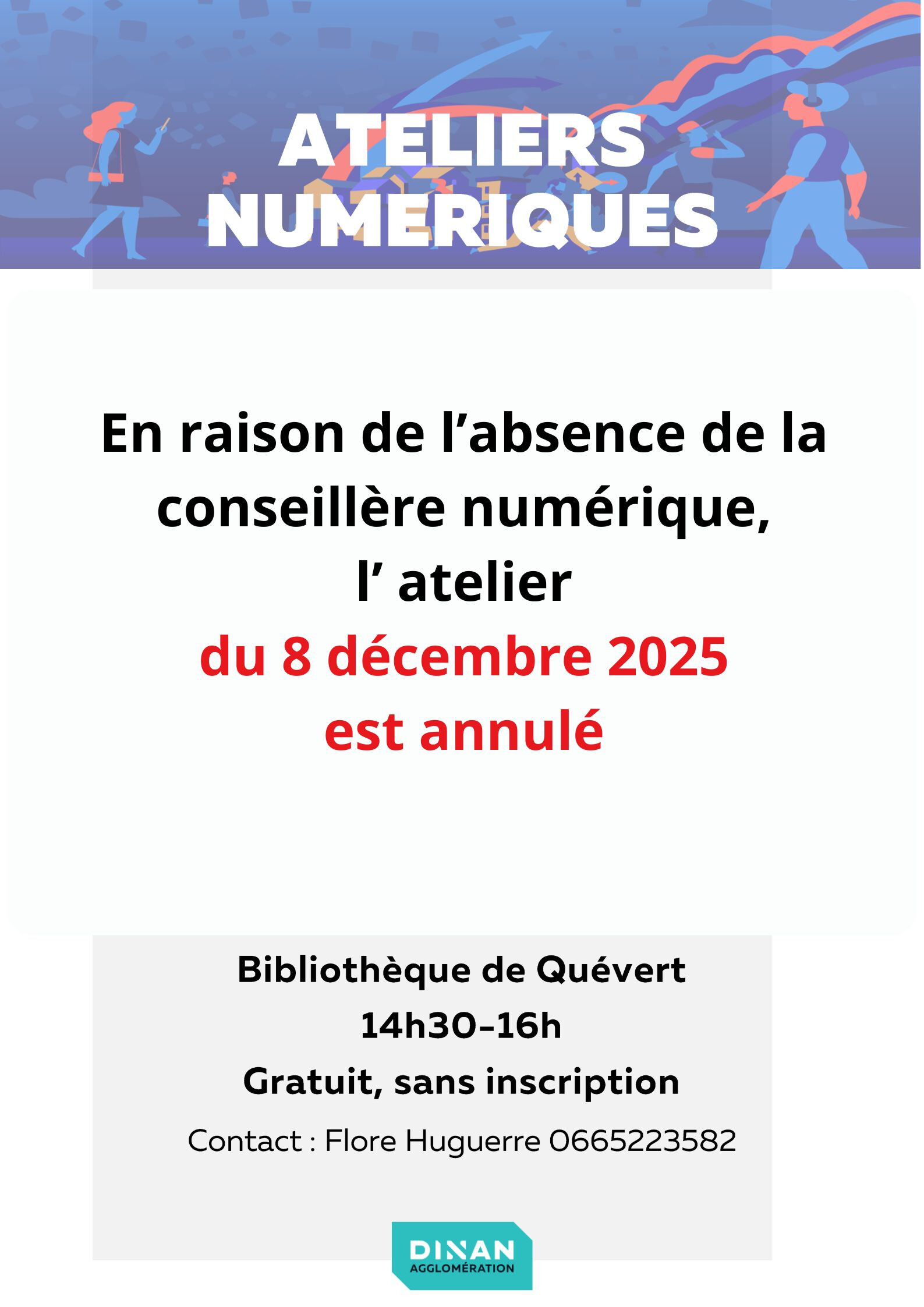 Les ateliers numériques reprennent à Quévert, le lundi des semaines impaires. Première séance le 1er septembre 2025. Consultez le planning ci-joint.