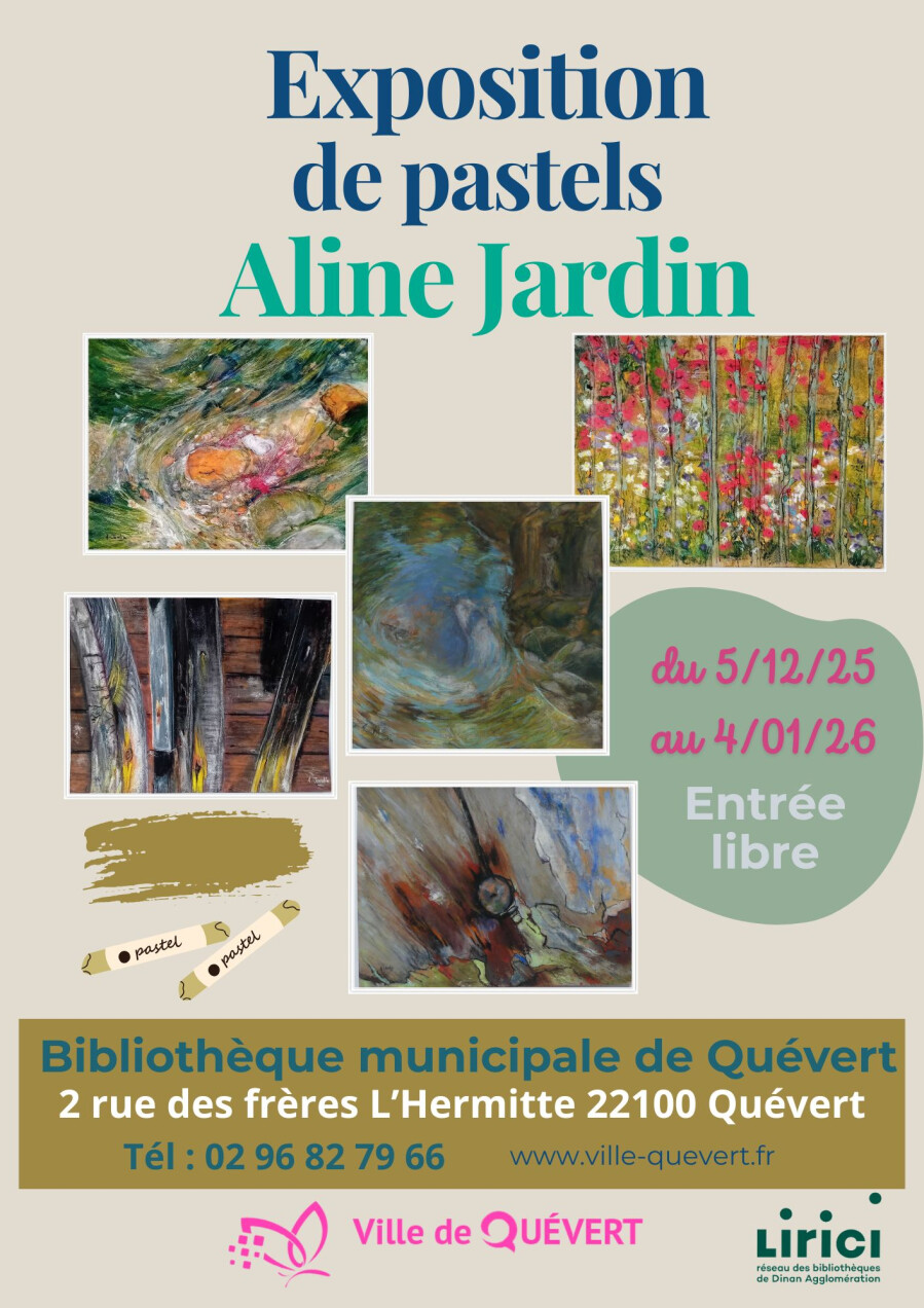 d'Aline Jardin. Peintre pastelliste amateur, elle présentera une vingtaine de tableaux colorés composés autour de ses sujets favoris, les textures, les formes, le minéral, la nature avec une prédilection pour les bords de mer.
