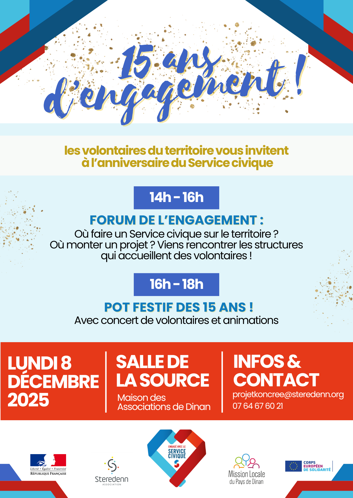 L'association Steredenn organise en partenariat avec la Mission locale du pays de Dinan et la DRAJES, une journée de célébration des 15 ans du Service civique, lundi 8 décembre2025