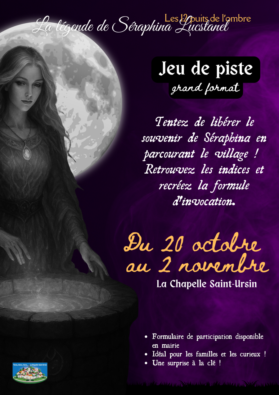 Pour les vacances d'Halloween, la municipalité vous a concocté un jeu de piste grandeur nature ! Parcourez le village, décodez les mystères et libérez Seraphina de l'emprise des puits.