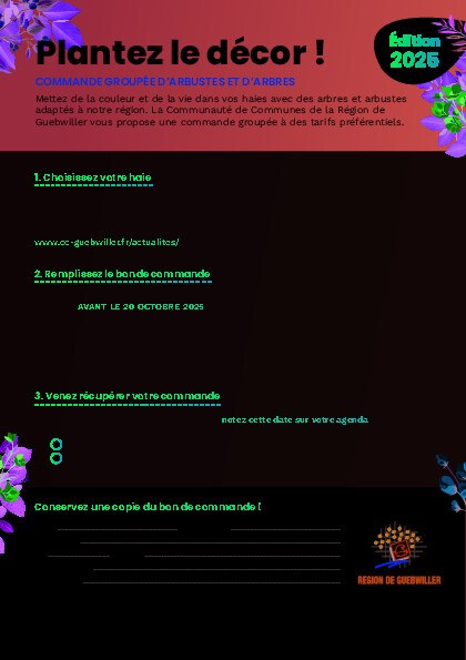 Il est à retourner au siège de la CCRG avant le lundi 20 octobre 2025, accompagné du paiement en chèque à l'ordre du pépiniériste Jean Gissinger.