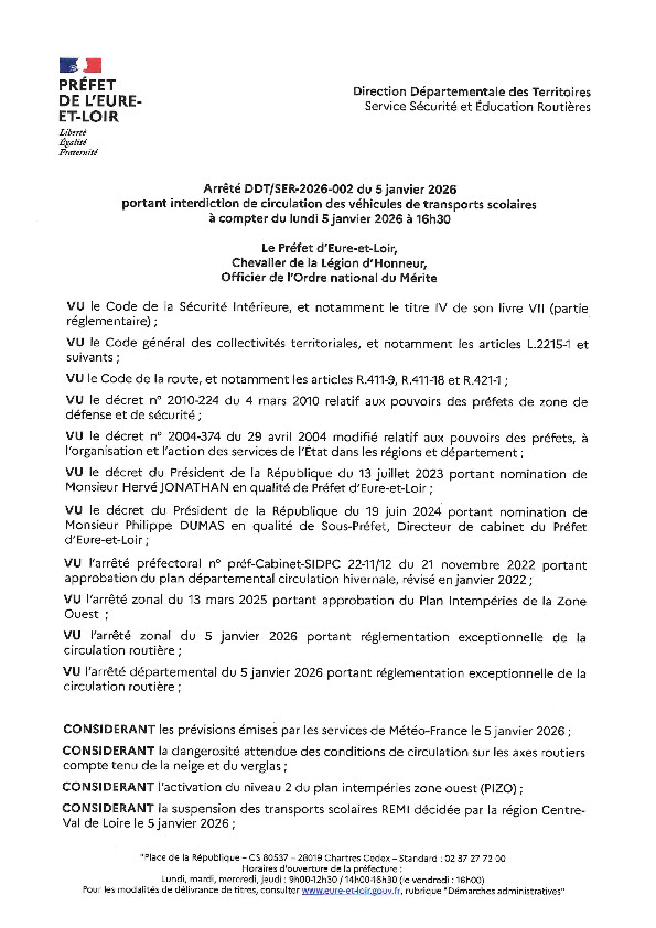 Suspendre l’ensemble des services de transports scolaires + réguliers toute la journée du mardi 06 janvier 2026 ;