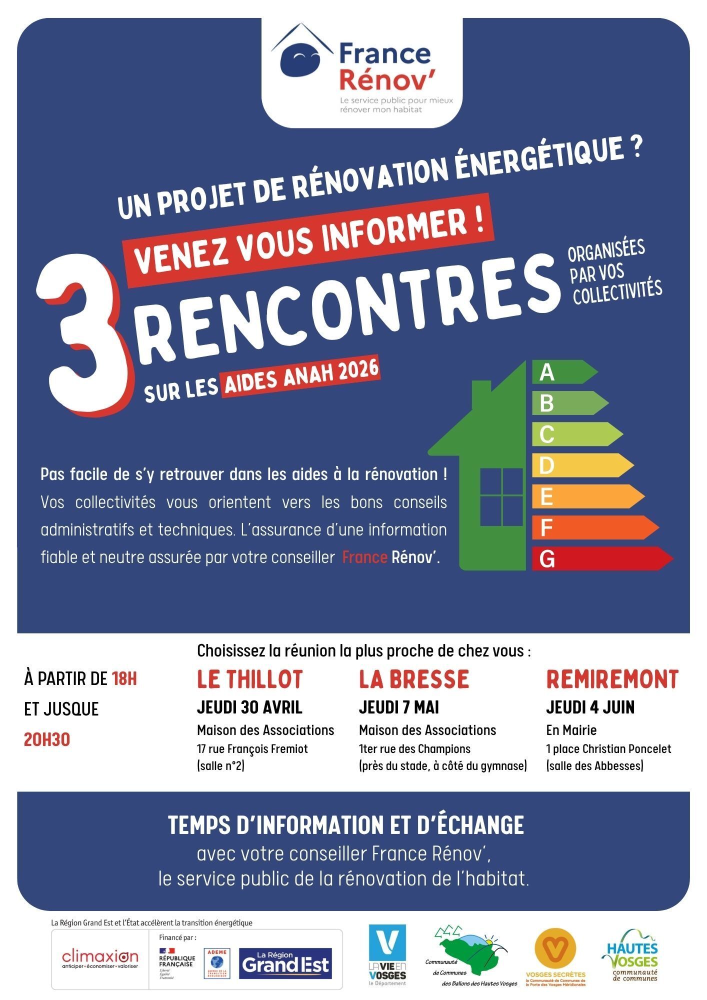 Vos collectivités et France Rénov’ organisent des réunions d’information ouvertes à tous, afin de proposer des conseils accessibles, fiables et indépendants sur la rénovation de l’habitat.