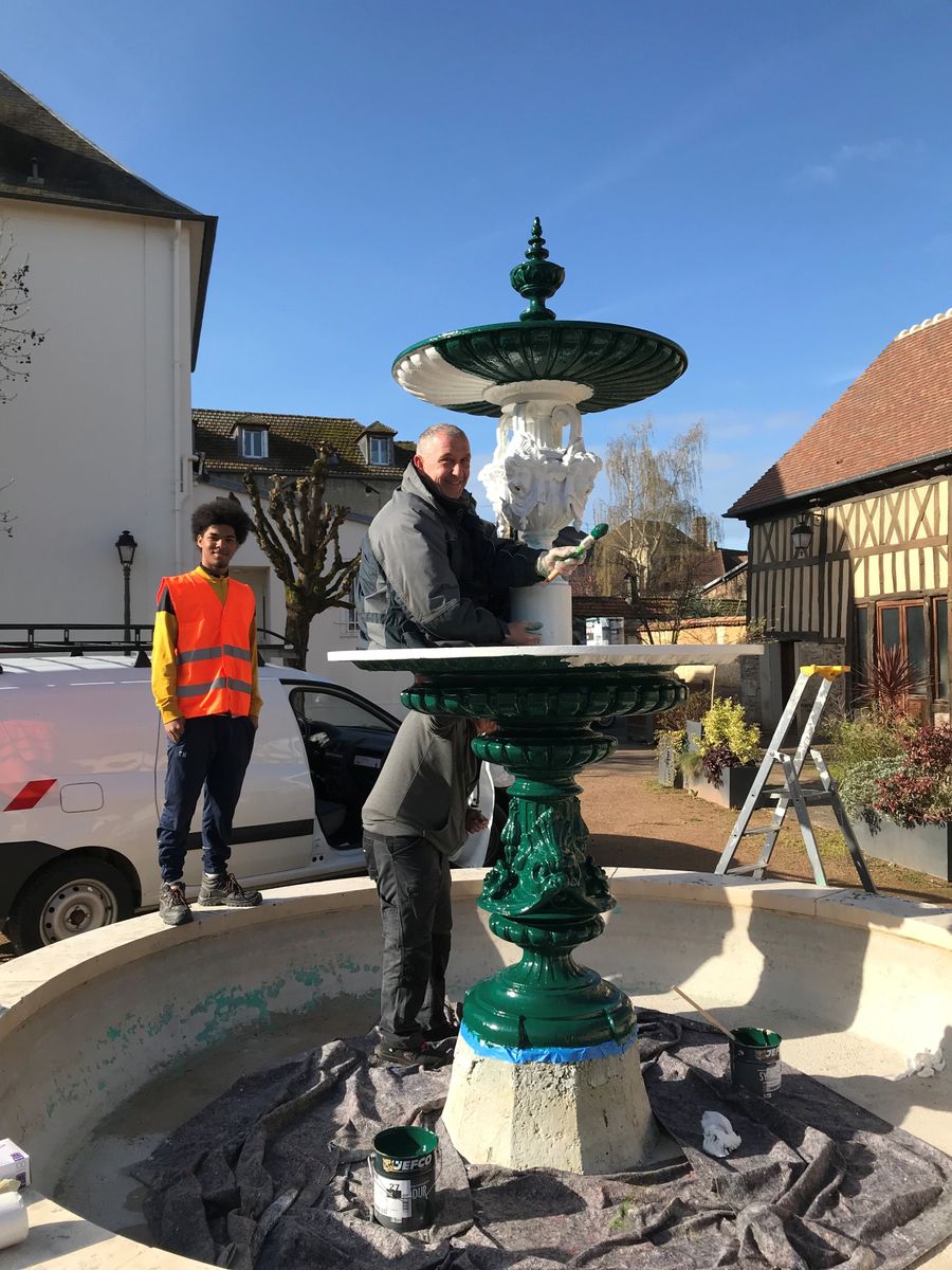 Avant sa remise en eau prochainement, la fontaine des Jardins de la Mairie est passée entre les mains des agents des services techniques pour un petit coup de fraîcheur ! Décapage, première couche avec un apprêt blanc adhérent et peinture finale verte : en ce printemps tout prochain, la fontaine est prête à retrouver sa mission rafraîchissante.