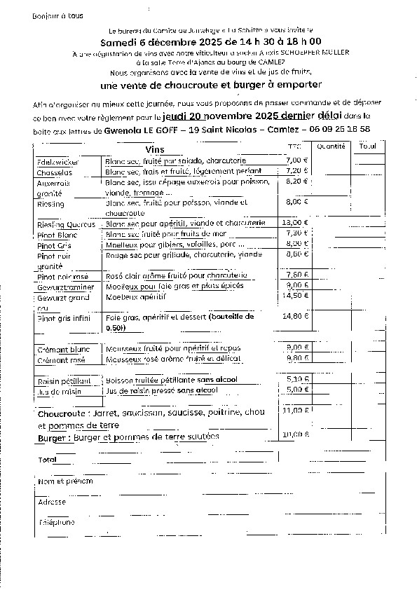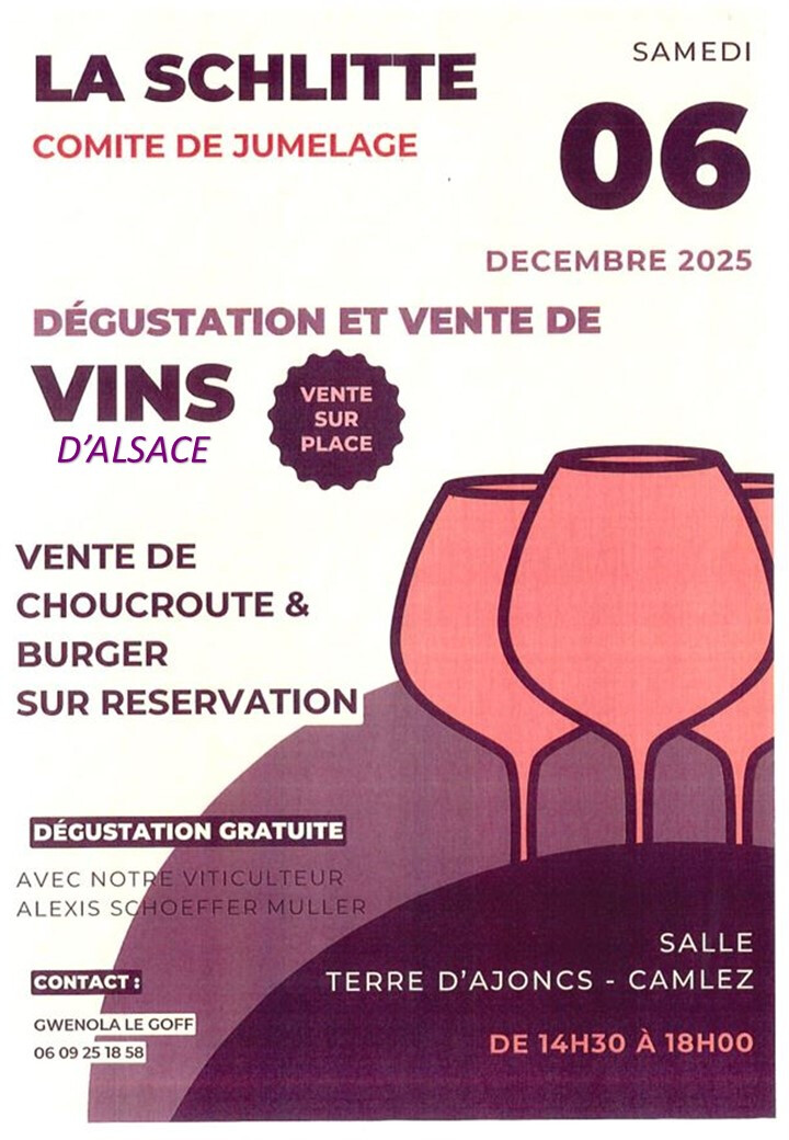 Le comité de jumelage vous propose une dégustation et vente de vins le 06 décembre 2025 de 14h30 à 18h00 à Terre d'Ajoncs