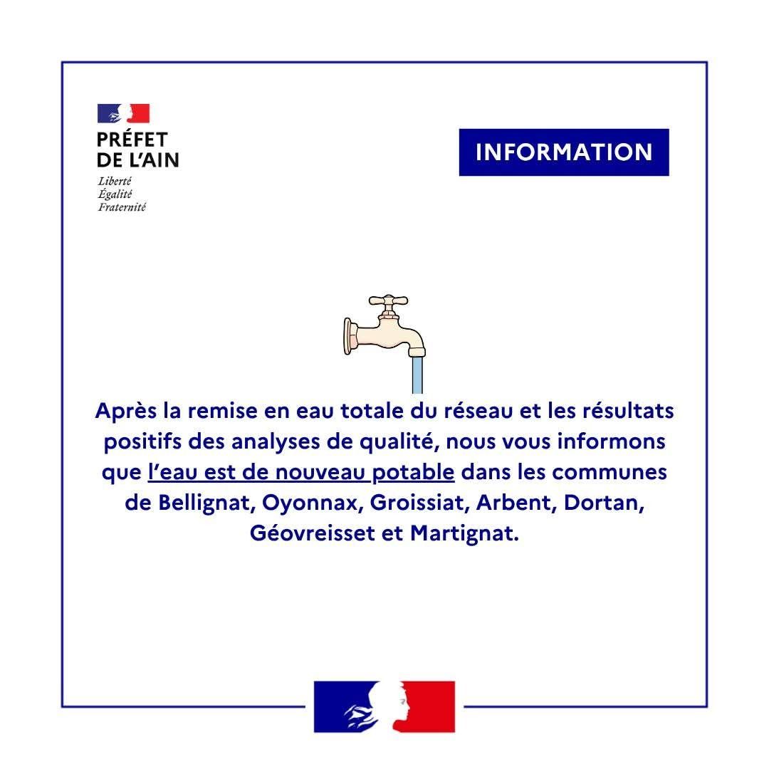 Nous avons le plaisir de vous informer que l'approvisionnement en eau 🫗 a été entièrement rétabli sur l'ensemble du territoire communal et que l'eau est de nouveau propre à la consommation.