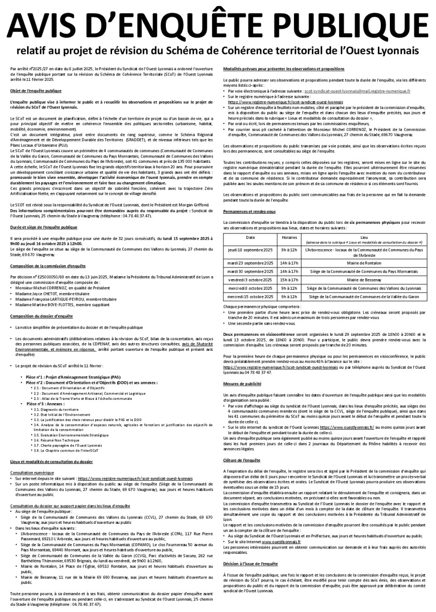 Par arrêté du président du SOL, le projet de révision du Schéma de cohérence territoriale (SCoT) de l'Ouest lyonnais est soumis à enquête publique du lundi 15 septembre 2025 à 9h00 au jeudi 16 octobre 2025 à 12h00.