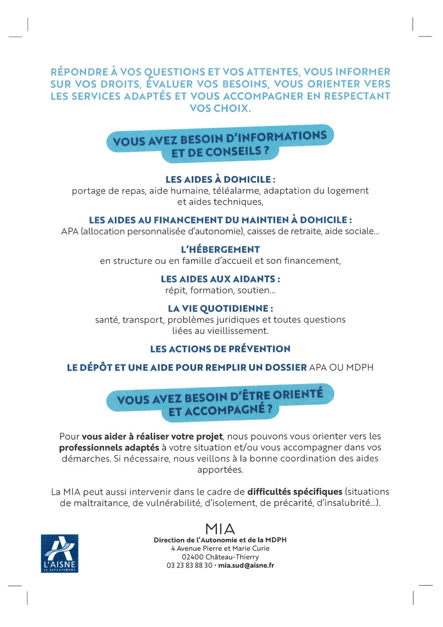 Ainsi, à compter du 1er octobre 2025, l'accueil, l'information, l'orientation et l'accompagnement des personnes âgées en perte d'autonomie sera assuré par la Mission Information pour l'Autonomie (MIA) rattachée au Service accès aux droits et accompagnement des parcours des Personnes Agées (SADAPPA) et déployée sur un zonage géographique maintenu identique.