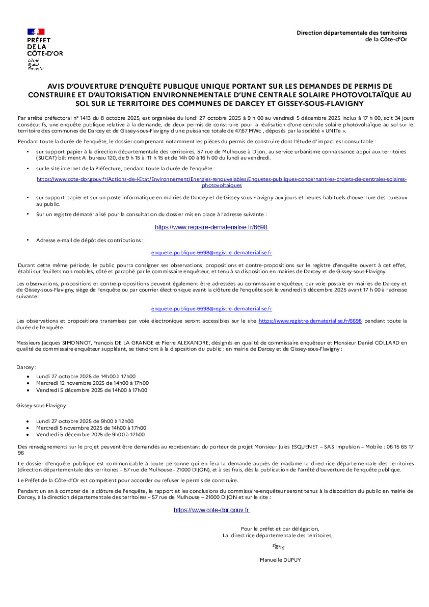 Des registres d’enquête publique et un dossier complet au format papier, seront mis à disposition du public dans les Mairies accueillant des permanences (Alise, Darcey, Salmaise, Flavigny, Venarey et Verrey).
