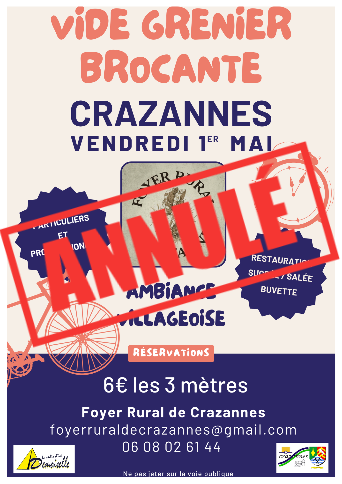 Par manque de bénévoles aidants et d'inscriptions préalables, la brocante du 1er mai 2026 à Crazannes est malheureusement annulée.