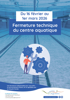 Le Centre aquatique Les Bassins de l’Aqueduc sera fermé du 16 février au 1er mars inclus pour cause de fermeture technique.