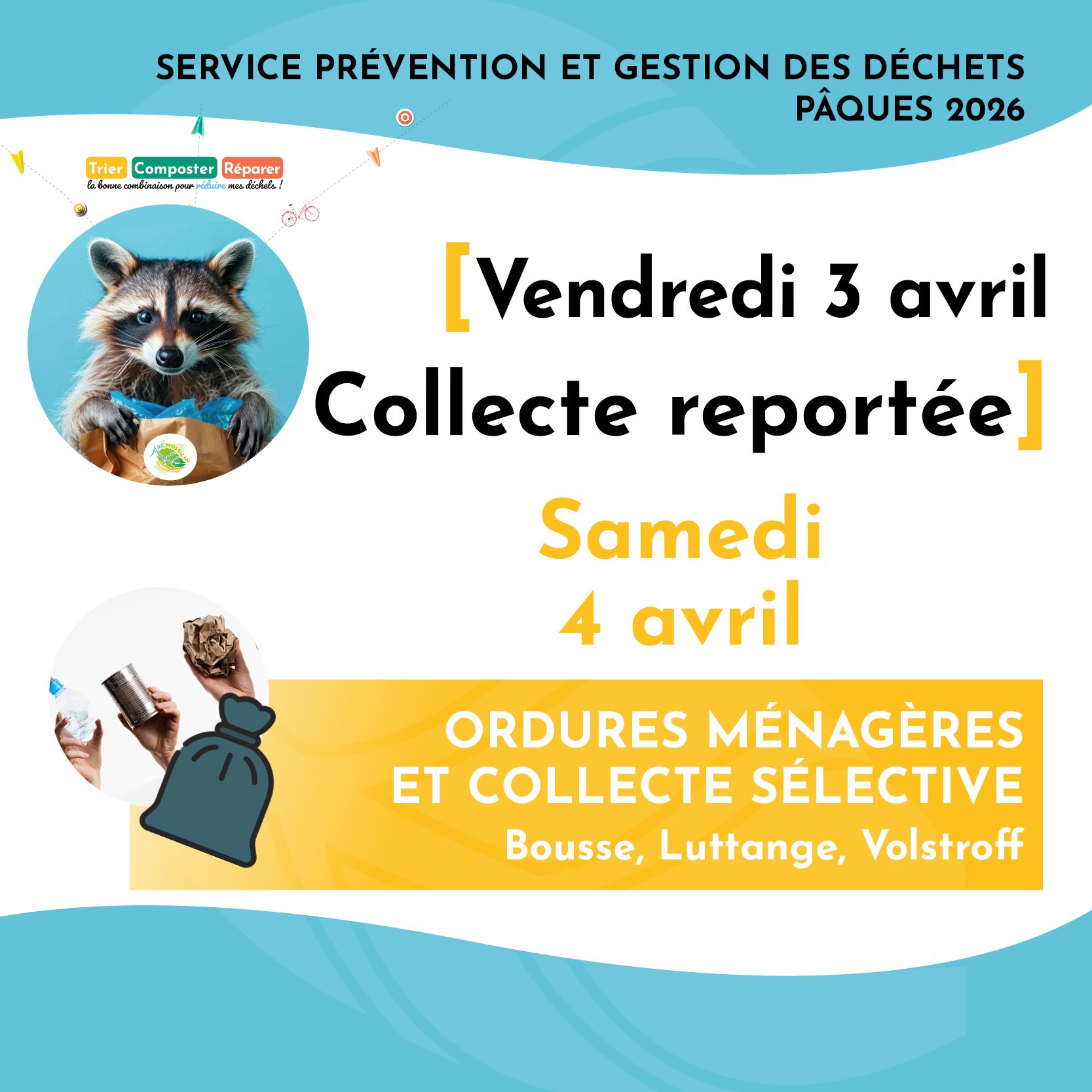 ⏭ Les collectes initialement prévues le vendredi 3 avril sont reportées au samedi 4 avril.