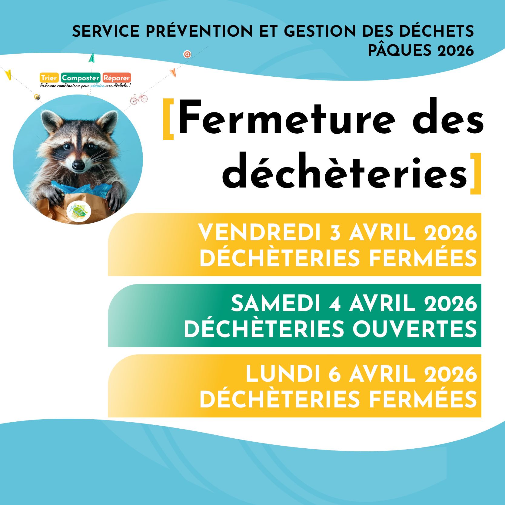 ⚠️ Nos déchèteries communautaires situées à Aboncourt, Guénange et Kœnigsmacker seront fermées le vendredi 3 avril et le lundi 6 avril mais vous accueillent le samedi 4 avril aux horaires habituels.