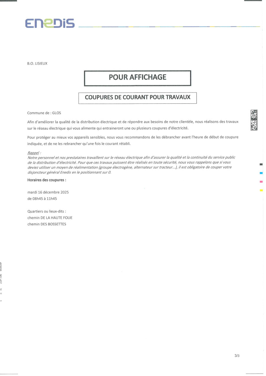 La coupure électrique prévue le mercredi 12 novembre Route de Courtonne est annulée.