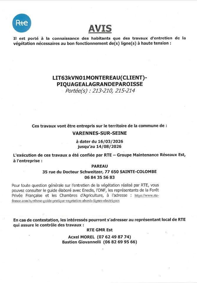 La société RTE, Gestionnaire du Réseau de Transport d'Electricité, procédera à un survol en hélicoptère des lignes à haute tension sur le territoire de la commune, du mardi 7 avril au vendredi 10 avril 2026.