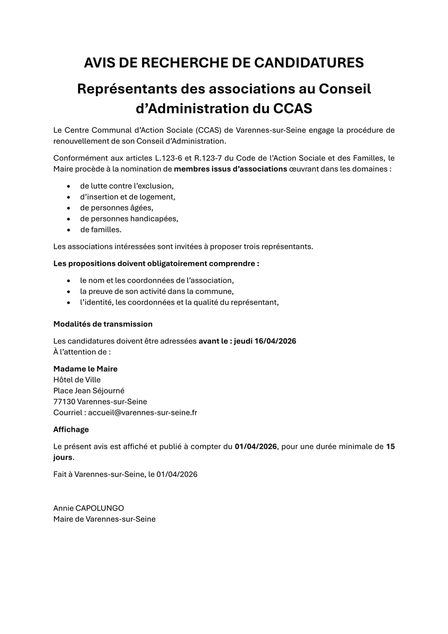 Le Centre Communal d’Action Sociale (CCAS) de Varennes-sur-Seine engage la procédure de renouvellement de son Conseil d’Administration.