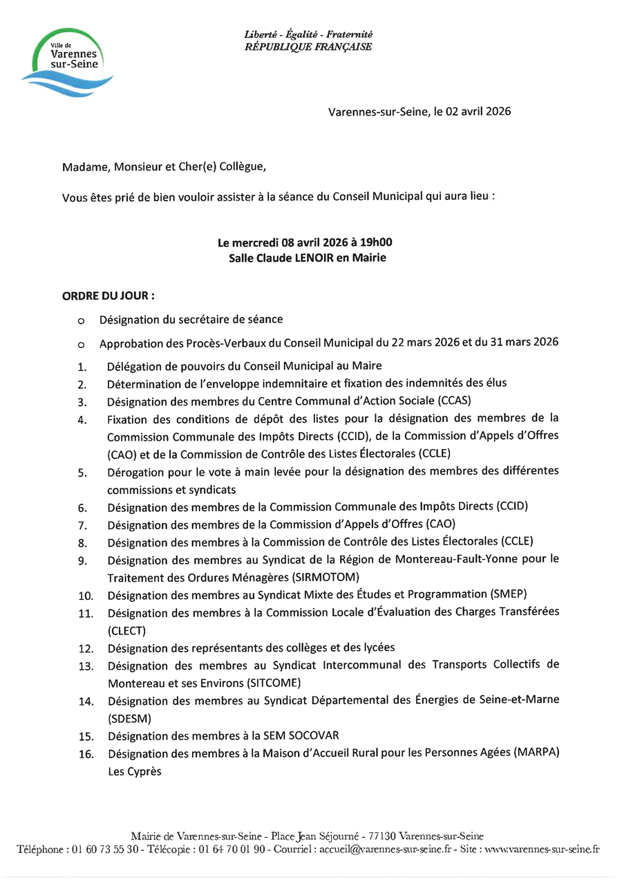 La séance du Conseil Municipal se tiendra mercredi 8 avril 2026 à 19h00 dans la Salle Claude Lenoir en Mairie