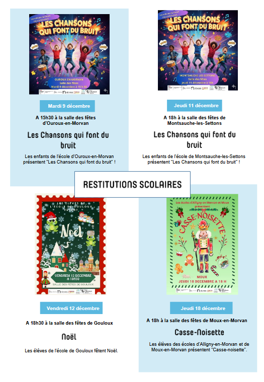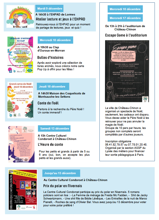 Mercredi 10/12 à 16h00, vendredi 12/12 à 18h00 et mardi 16/12 à 17h30