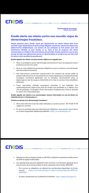 Vous trouverez en pièce jointe le communiqué de presse d’Enedis du 30 janvier dernier, relatif à une nouvelle vague de démarchages frauduleux visant ses clients.