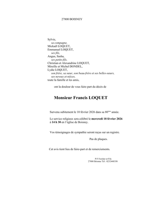 A la demande de la famille, nous vous annonçons le décès de Monsieur Francis Loquet, ancien président du comité des fêtes de Boisney.