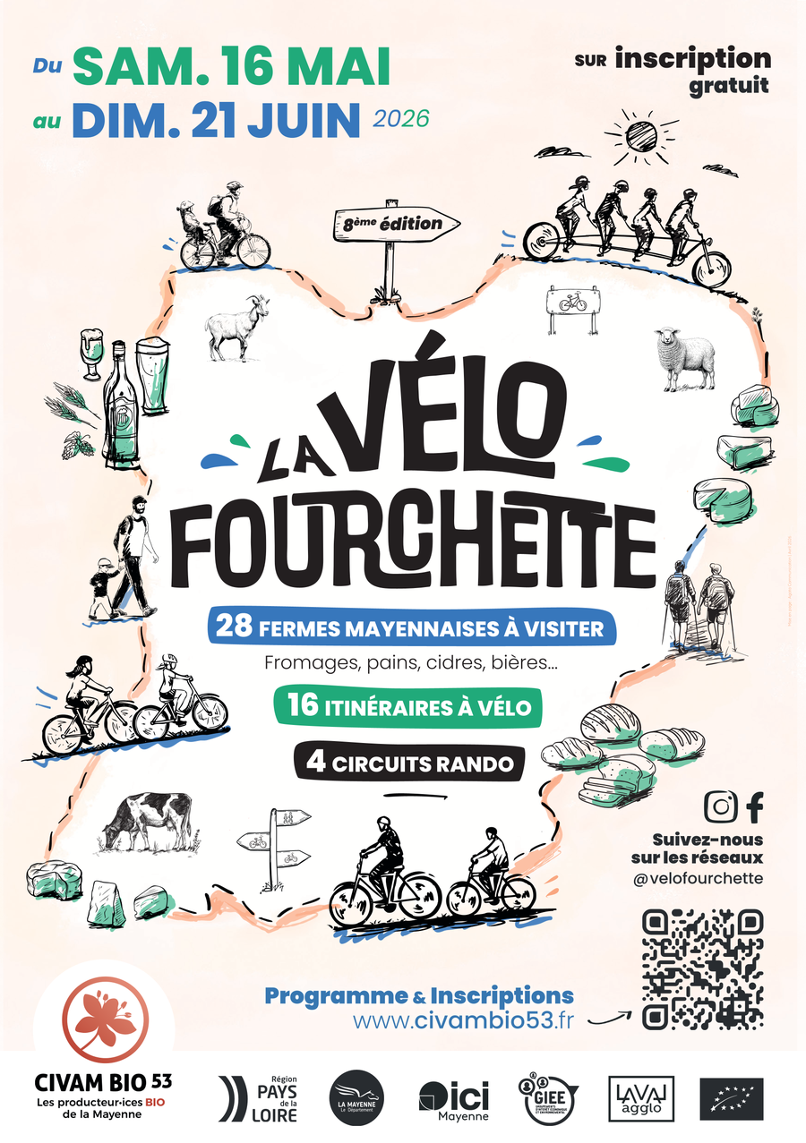Nous avons le plaisir de vous partager le programme de la Vélo Fourchette 2026, un événement familial et convivial qui propose de découvrir les bons produits fermiers mayennais tout en pédalant ou marchant à votre rythme ! 🚴♂️🧀