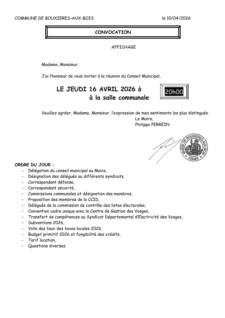 Vous trouverez ci-joint la convocation et l'ordre du jour du prochain conseil municipal.