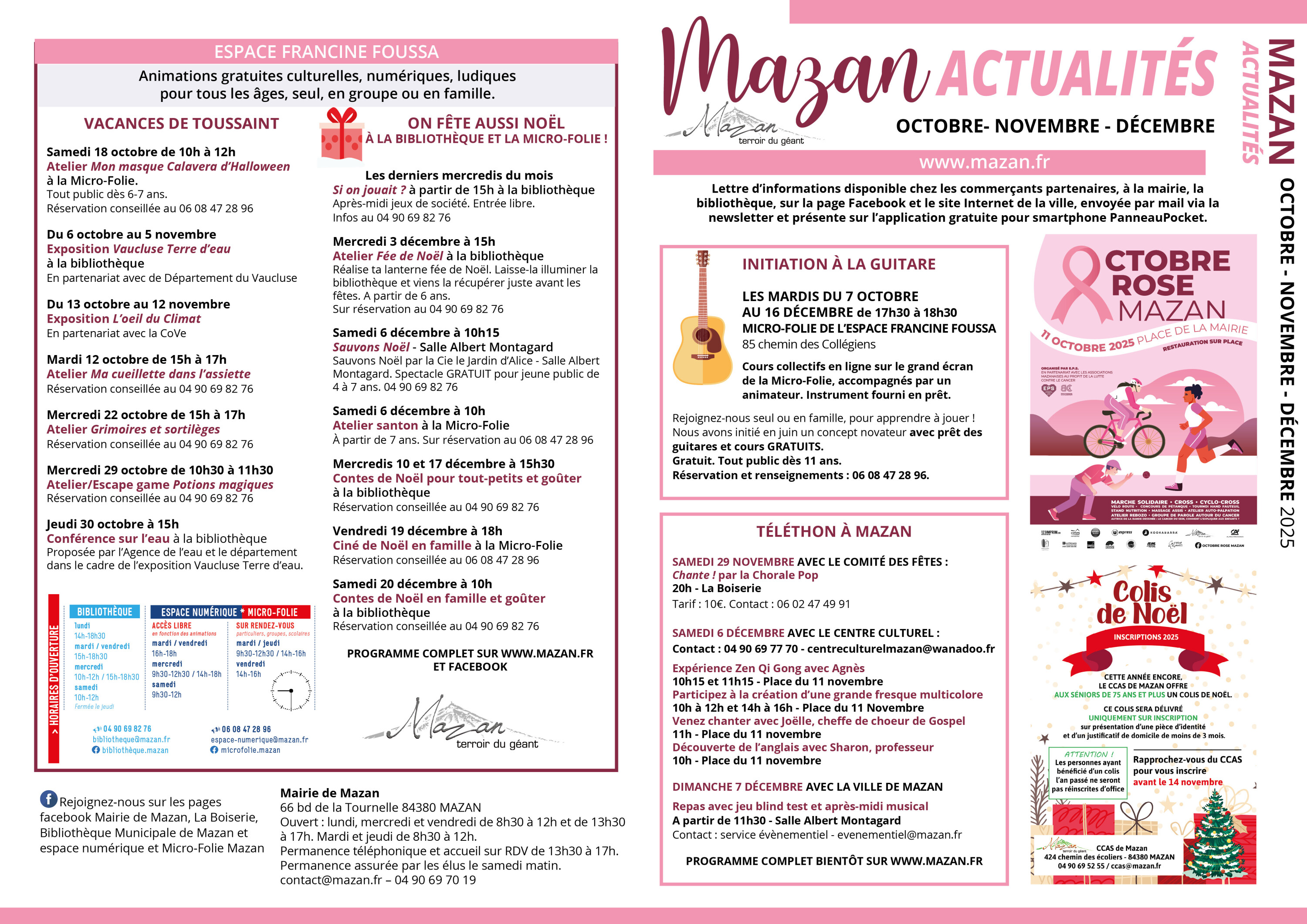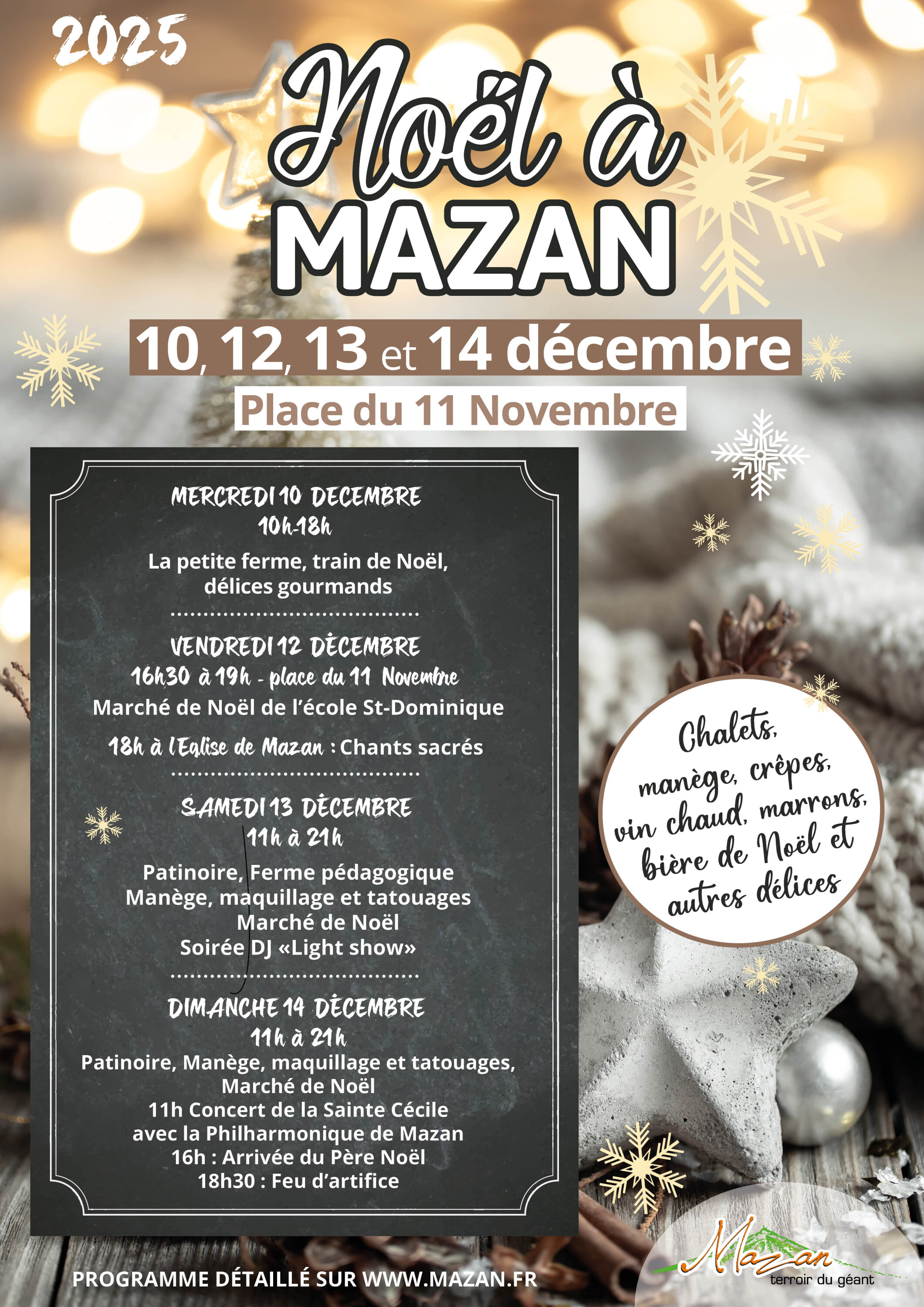 Le compte à rebours est lancé : Noël à Mazan arrive à grands pas, avec encore plus de surprises cette année ! Toute la commune s’est mobilisée, aux côtés des associations et écoles, pour vous proposer une édition extraordinaire, rythmée par des activités inédites et de grands classiques qui raviront petits et grands.✨ Laissez-vous emporter par la magie en embarquant à bord du petit train de Noël 🚂 !