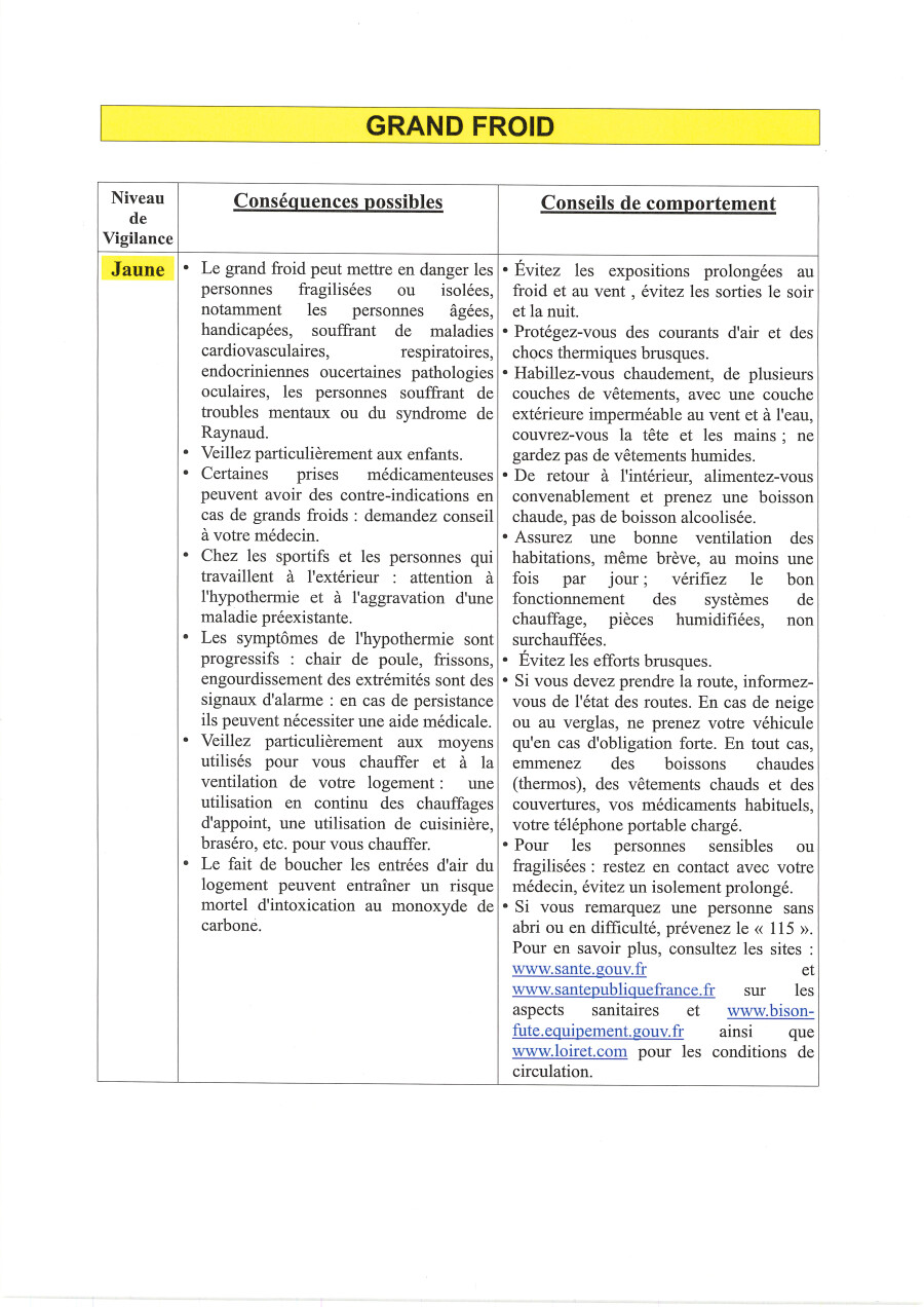 Météo France place le département du Loiret en vigilance jaune pour le phénomène Grand froid à compter du mardi 30 décembre 00h et pour 48h en raison de températures négatives à venir (sont prévus en ressenti -10°C la nuit et 0°C en journée).