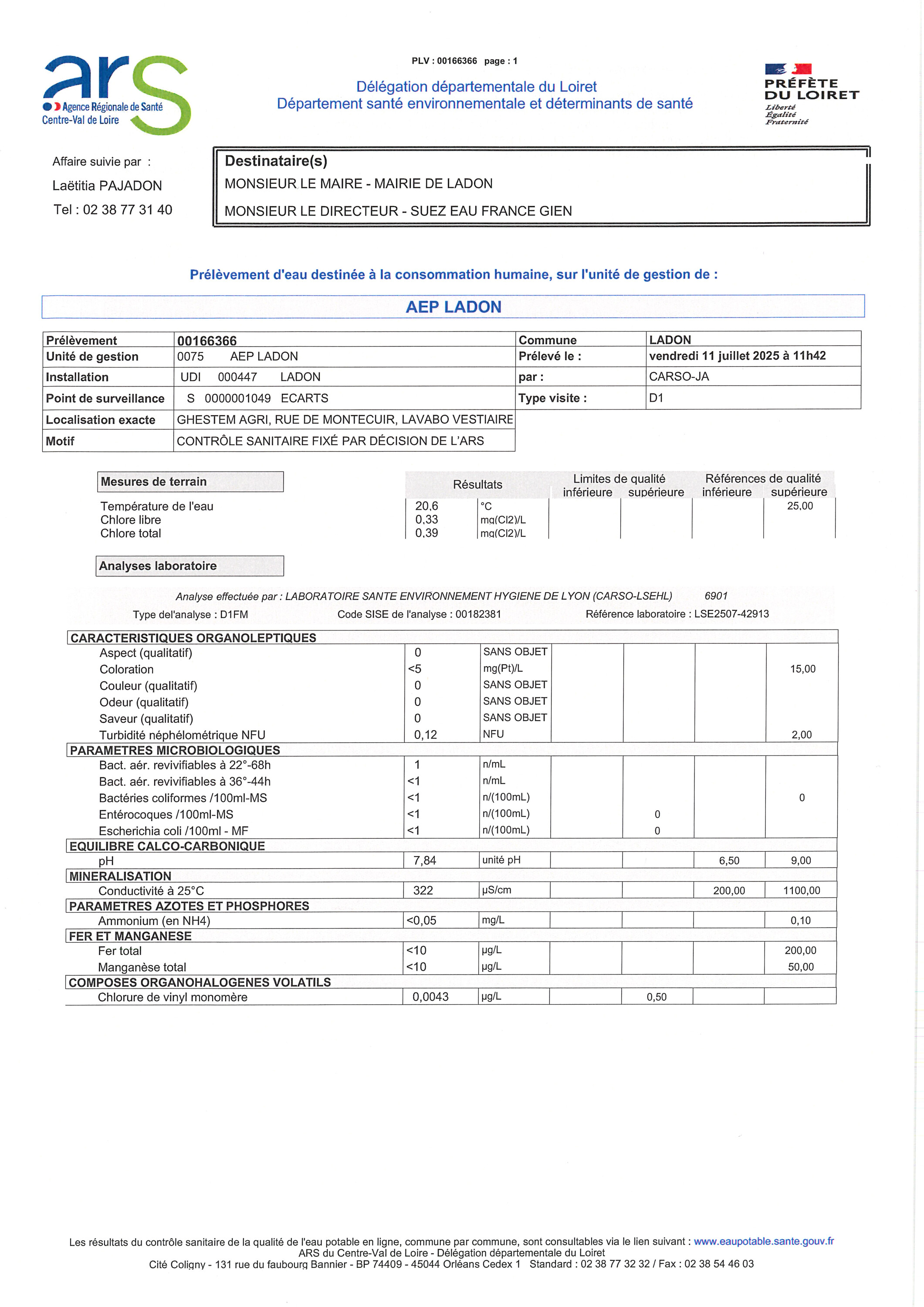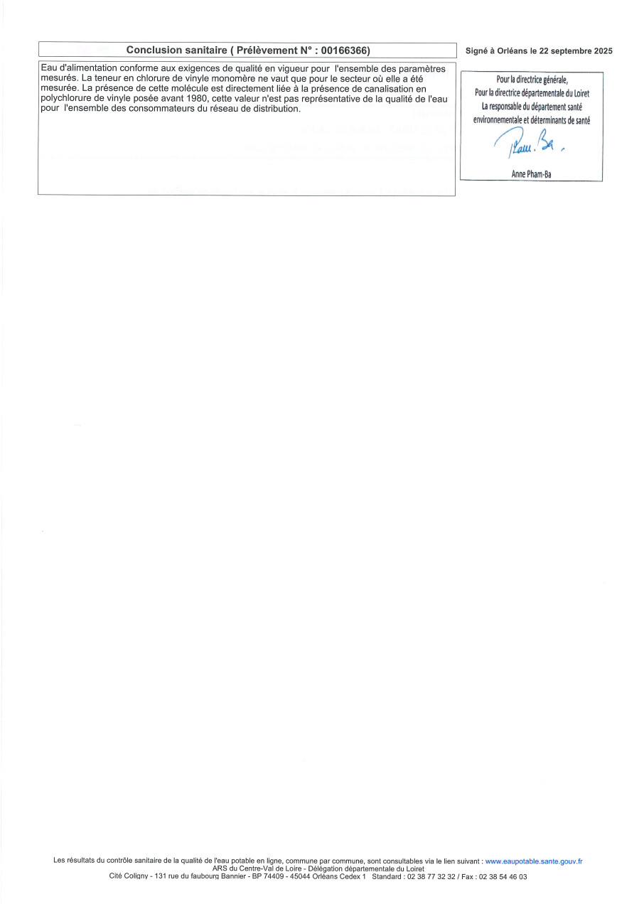 Ci dessous les résultats du contrôle sanitaire des eaux de Ladon destinée à la consommation humaine. Ils sont émis par l'ARS Centre Val de Loire en date du 22 septembre 2025 sur les prélèvements effectués le 11 juillet 2025 et reçu en mairie le 30 septembre 2025 .