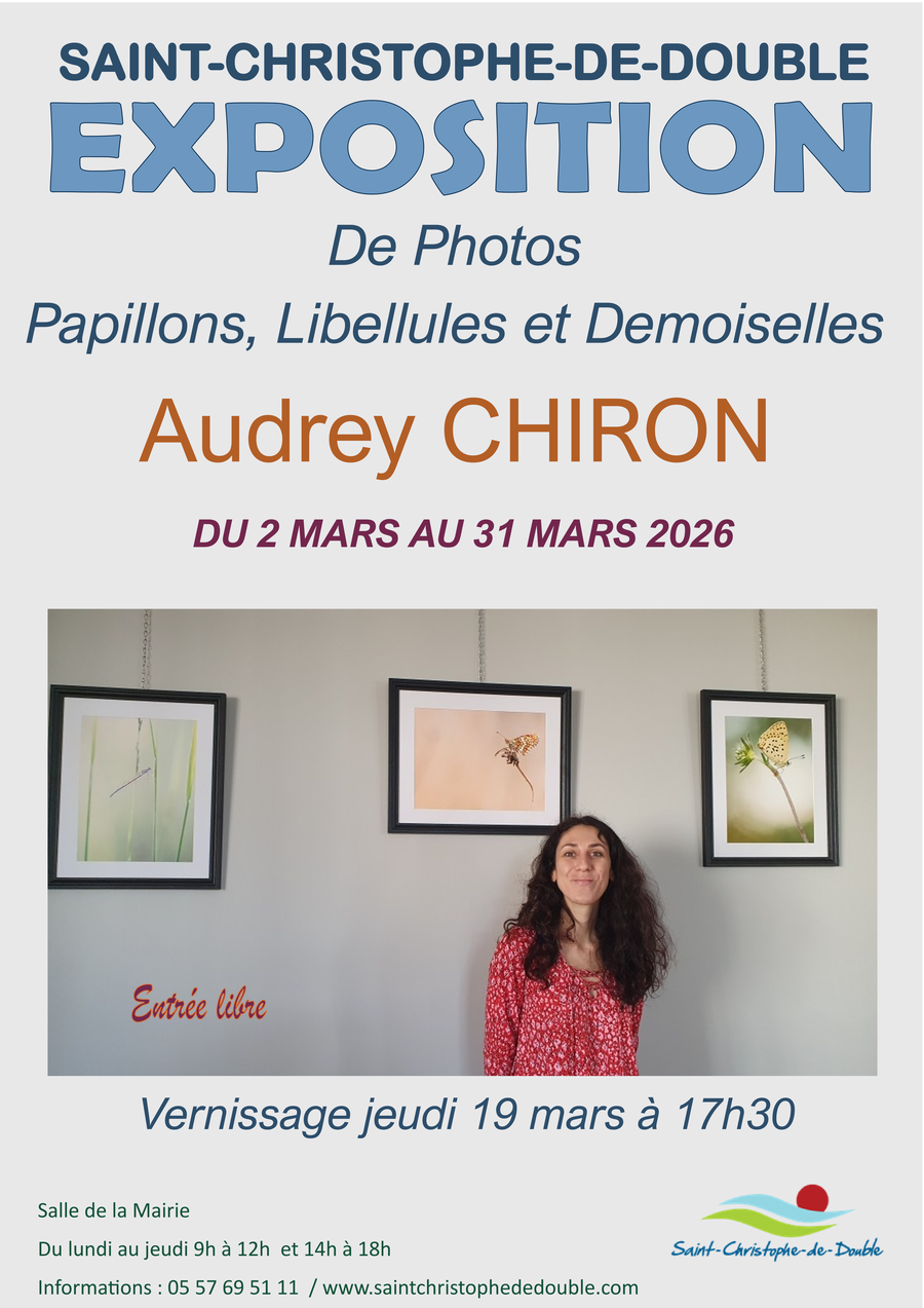 Dans cette exposition, salle de la mairie, Audrey CHIRON met à l’honneur les papillons, les libellules et les demoiselles. Ce travail est le fruit d’une passion, menée au gré de ses balades presque quotidiennes. À travers cette série, elle explore la douce lumière du soir, la nature au bord de nos rivières, nos étangs depuis maintenant 4 ans. Photographe amatrice, autodidacte, naturaliste, chaque cliché qu’elle souhaite doux et poétique, est le résultat de longues heures de patience qu’elle accepte de partager. En 2024, elle a rejoint le photo club de sa commune à Saint-Seurin-sur-l’Isle, (le PCSS) qui m’a encouragée à les exposer pour la première fois lors de la fête de la photo en octobre où elle a remporté le premier prix du public. Cette expérience encourageante, enrichissante, de partage, lui a donné un nouvel élan pour poursuivre cette passion.