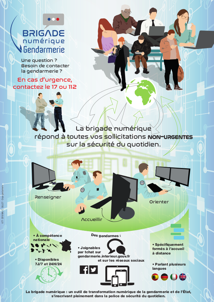 Pour les question non urgente, la brigade numérique vous répond 7j/7 et 24h/24 https://www.gendarmerie.interieur.gouv.fr , sur les réseaux sociaux (facebook, twitter)