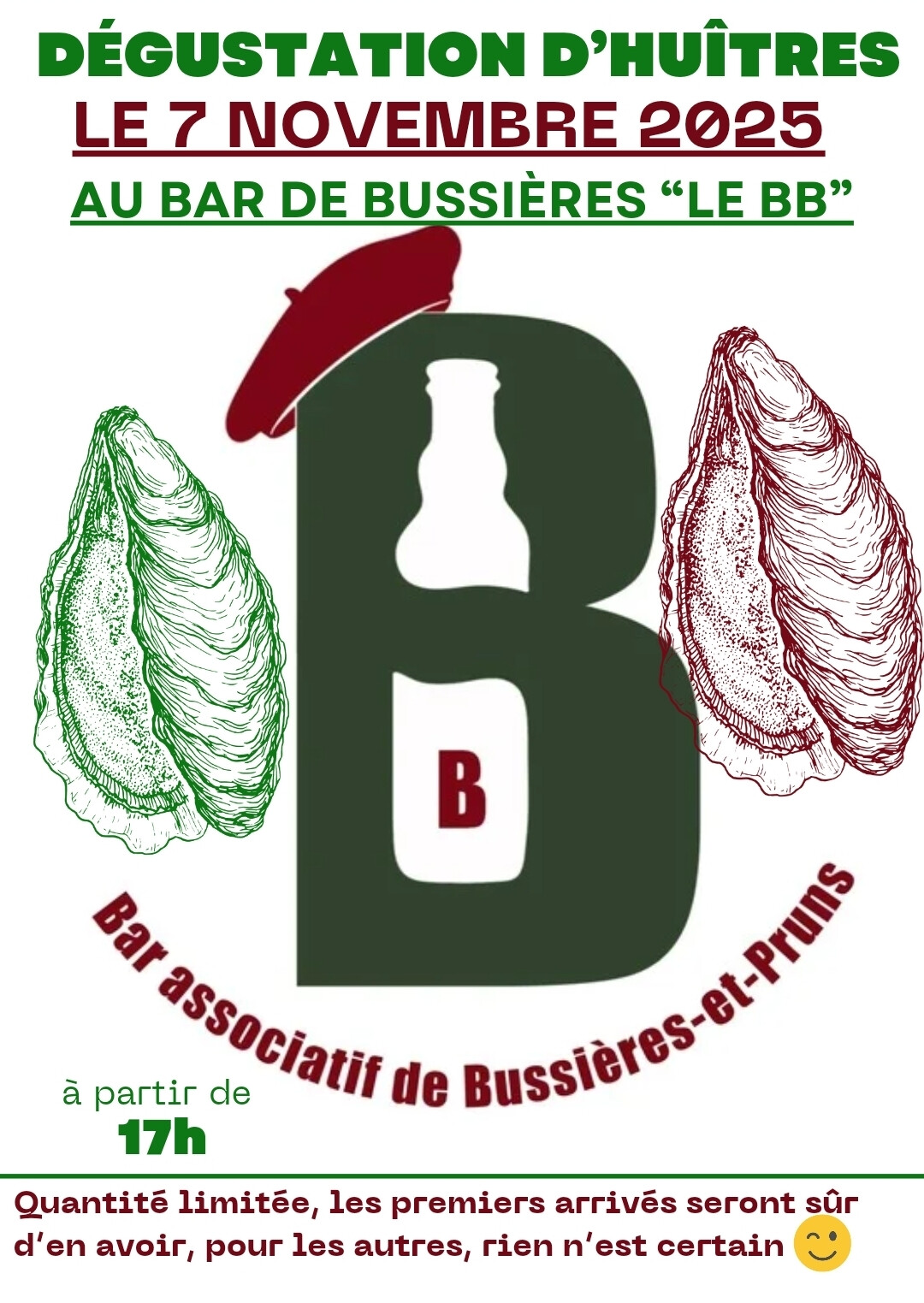 Vendredi 7 novembre, l'association le bar de Bussières dit le BB organise une soirée dégustation d'huîtres. Pour ceux qui n'aiment pas il y aura des crevettes à la plancha .