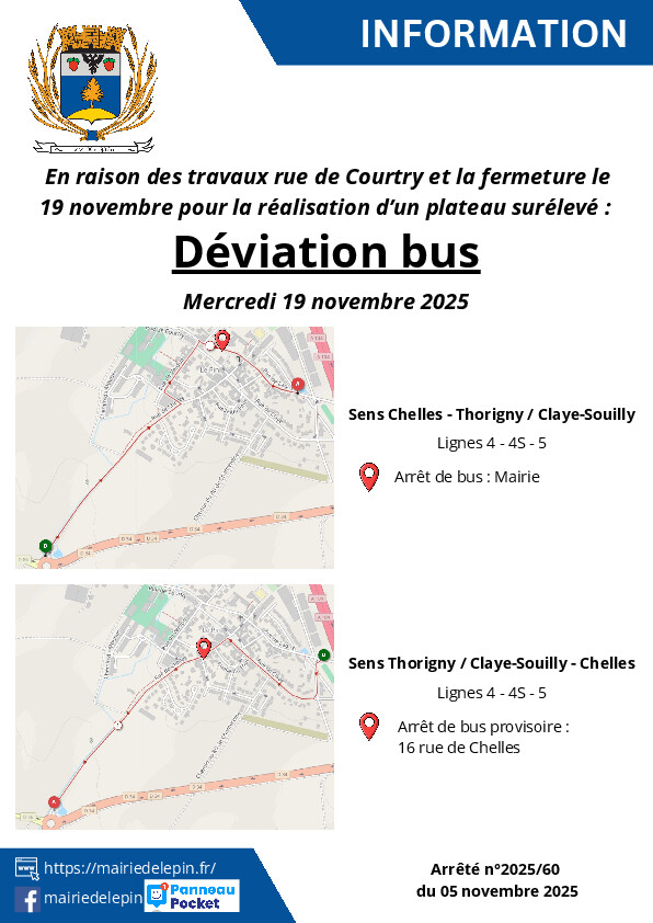 Les lignes de bus 4, 4S et 5 (Keolis) seront impactées le 19 novembre en raison de la fermeture de la rue de Courtry.