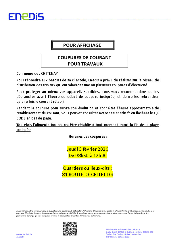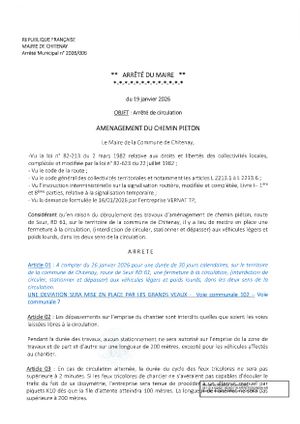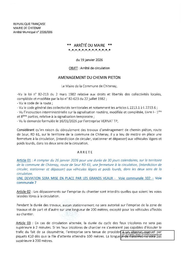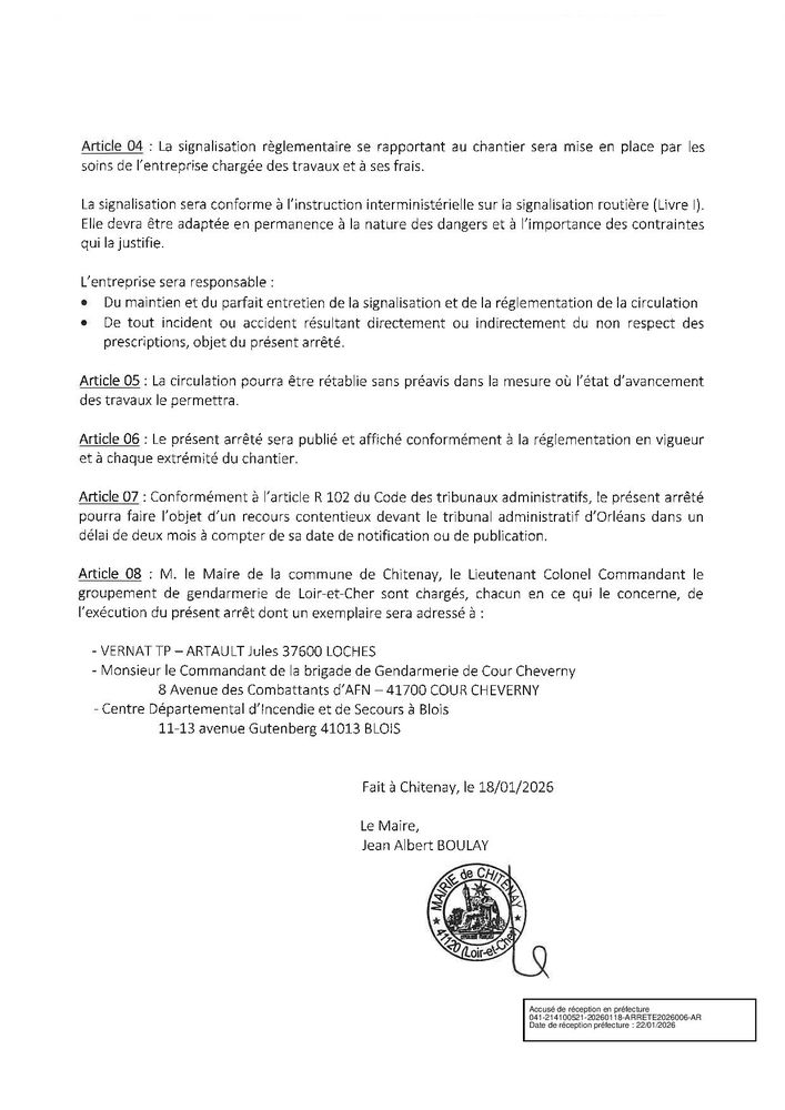 A compter du 05 janvier 2026 pour une durée de 40 jours calendaires, sur le territoire de la commune de Chitenay,