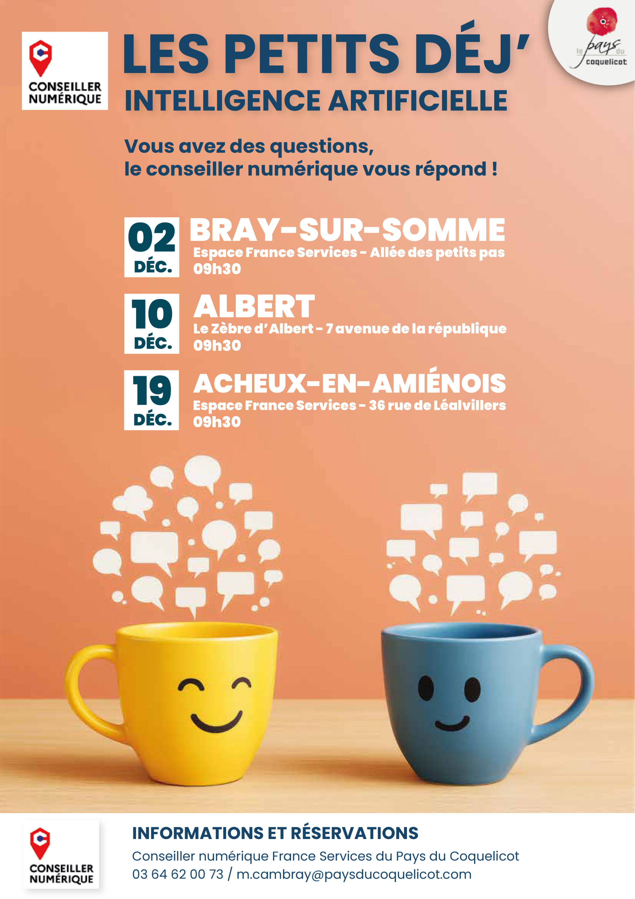 La Communauté de Communes du Pays du Coquelicot propose 3 petits-déjeuners autour de l’intelligence artificielle destinés aux habitants. Cette animation gratuite a pour objectif de présenter simplement l’IA, d’éclairer ses usages concrets et de répondre aux questions ou inquiétudes que le sujet peut susciter.
