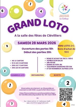L'APE de l’école organise son loto annuel le samedi 28 mars à partir de 18h à la salle des fêtes de Clévilliers.