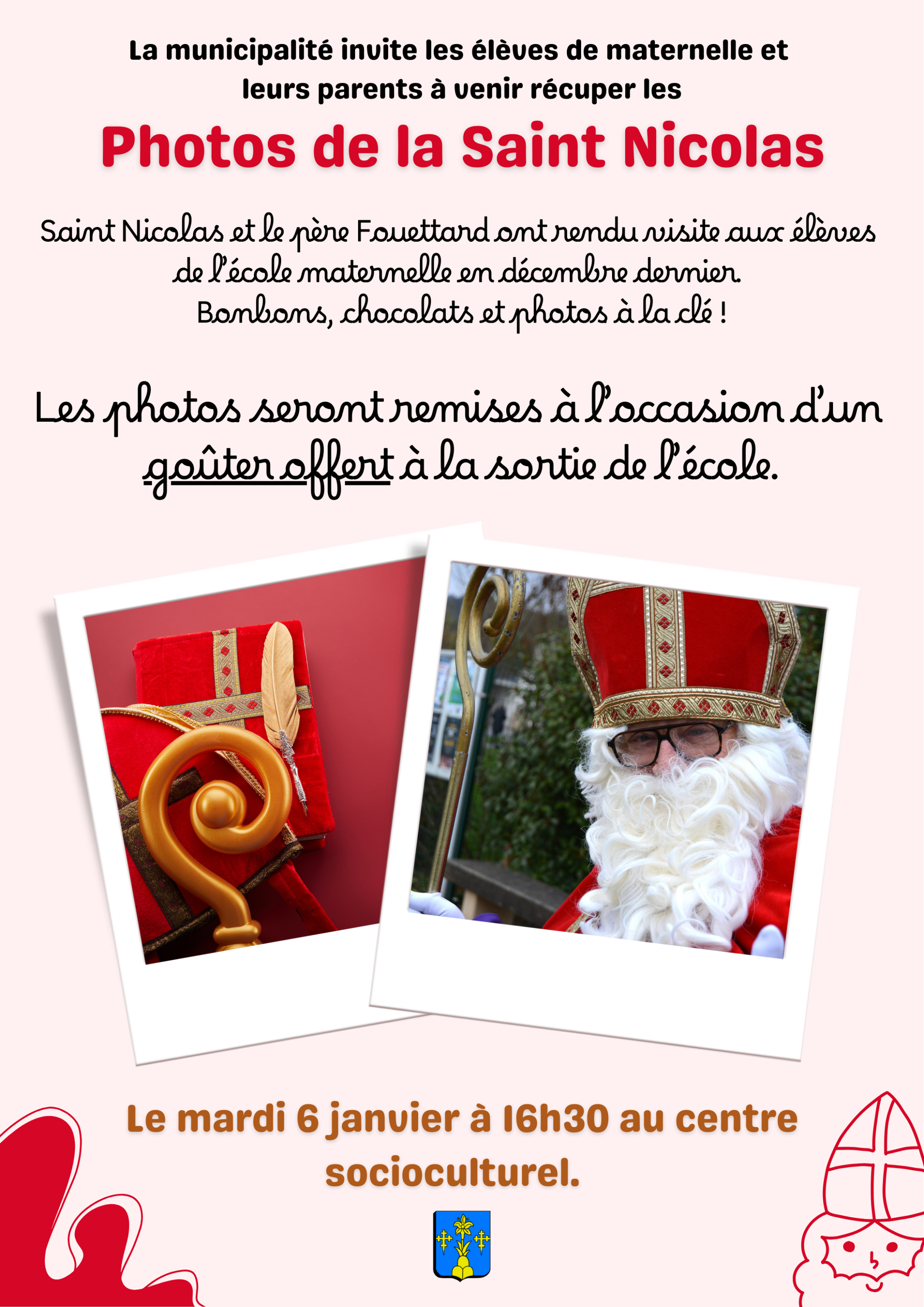 La municipalité invite les élèves de maternelle et leurs parents à venir récupérer les photos prises lors de la visite de Saint Nicolas et du Père Fouettard en décembre ! Un goûter est organisé à cette occasion.